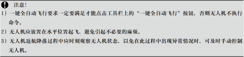 飛行前首先檢查是否滿足一鍵全自動飛行要求(油門打到最低,手、自動切換開(kāi)關撥至自動模式,上傳至少一個航點),并參見注意事(shì)項内容,若滿足則可執行一鍵全自動飛行功能(néng),不滿足則需待條件滿足後(hòu)再執行一鍵全自動飛行功能(néng)。