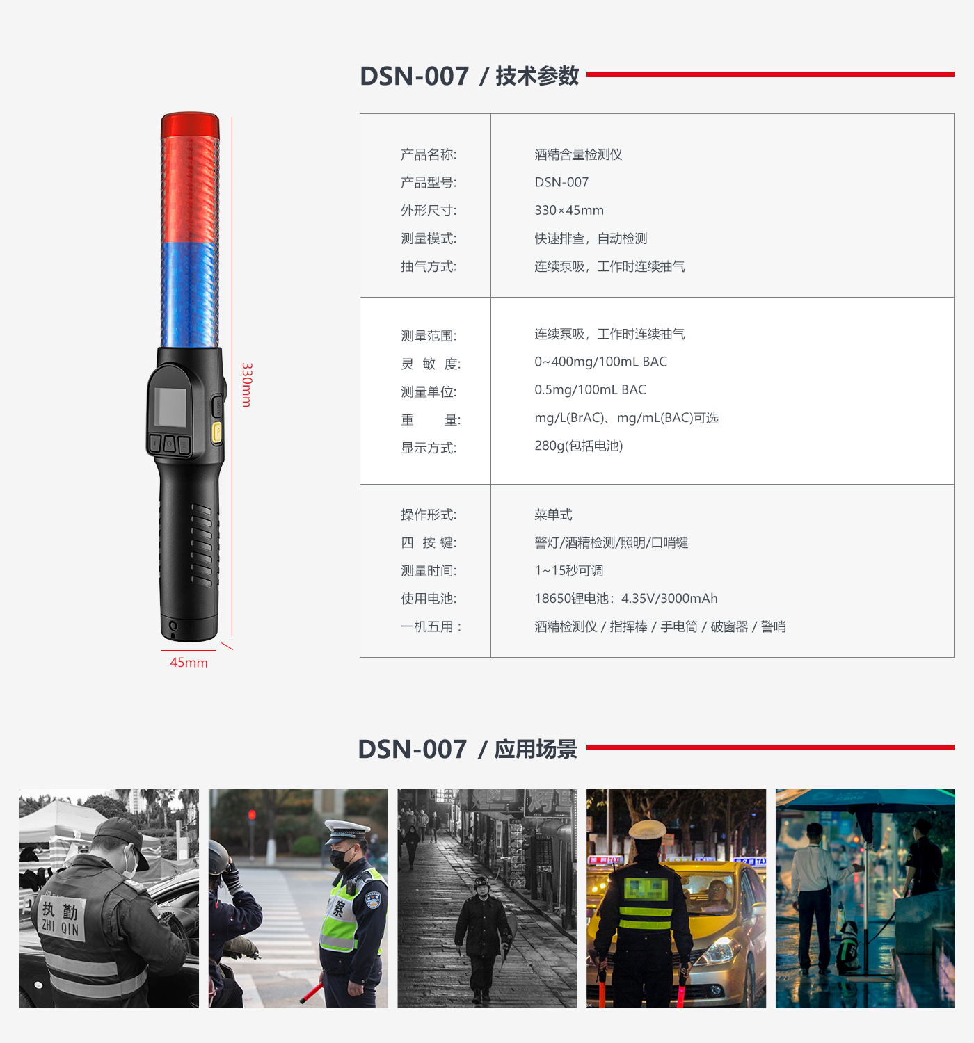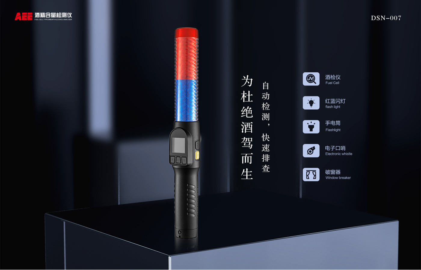 AEE DSN-007酒精測試儀,是科視達專爲道(dào)路交通執法研發(fā)的警用裝備,集酒精測試、交通指揮、照明、聲光報警、電子口哨等多功能(néng)爲一體,具備檢測迅速、精準,操作簡單及輕巧便攜等特點。