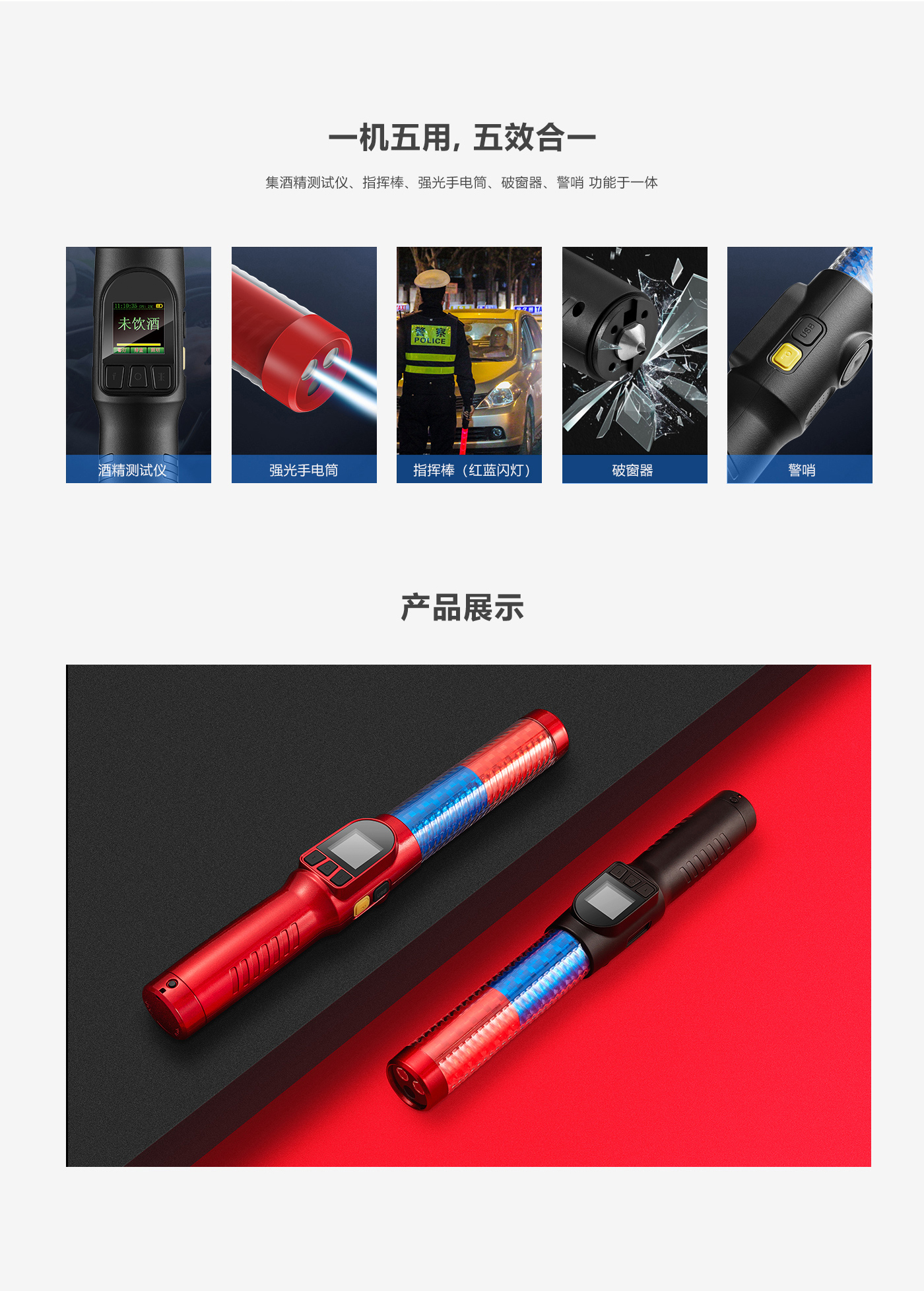 一機五用:酒精測試儀、指揮棒、強光手電筒、破窗器、警哨;