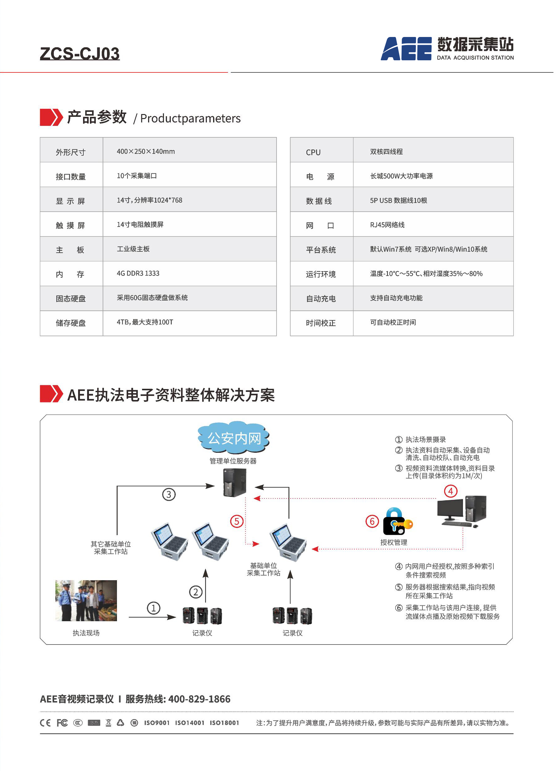 ZCS-CJ03 數據采集站 AEE數據采集站 ,利用高配置主機(硬件),搭載電子證據管理系統(軟件),通過(guò)多個數據傳輸接口,同時連接多個執法終端設備,例如:單警視音頻執法記錄儀、4G智能(néng)執法記錄儀等,實施視頻、圖片等數據資料的識别及上傳管理。 10⼝帶屏幕采集⼯作站 可同時連接 10台執法記錄儀 雲數據管理 采集站可直聯雲管理平台,實現文件 管理,警情傳達,考核監督等在線功能(néng) 對(duì)記錄儀數據進(jìn)行讀取