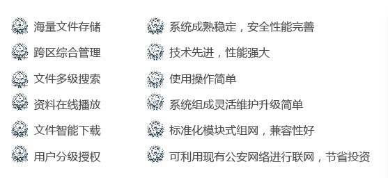 AEE執法電子資料管理系統: 電子資料管理系統能(néng)夠彙總基層單位采集工作站收集的執法資料信息,在公安網上供授權用戶查詢與調 用,并提供了一套資料搜索引擎與統計系統,能(néng)夠使用戶快速通過(guò)姓名,警号,單位,時間,類型等各 種(zhǒng)信息定位要尋找的資料,并能(néng)對(duì)下級單位或具體民警在指定的時間内工作量做統計,能(néng)有效掌握民警 執法情況。針對(duì)不通級别的用戶,可以分配不同的權限,實現有序管理的同時保障了資料的安全。