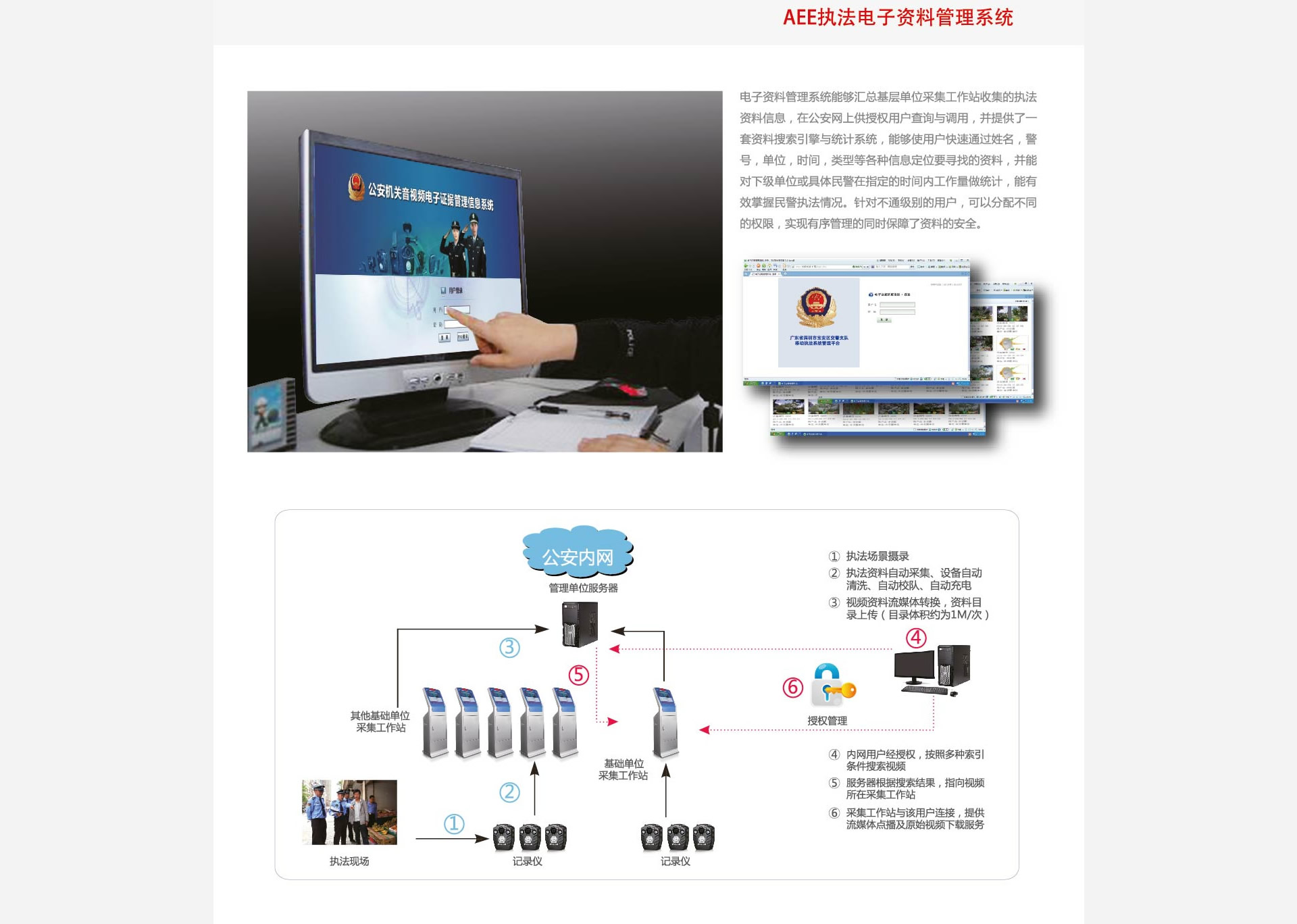 AEE執法電子資料整體解決方案: 執法攝錄、資料存儲、綜合管理三位一體 更貼近實戰要求的前端執法記錄儀設備 無人職守模式,資料自動采集自動完成(chéng),節省大量人力和時間 模塊化組網模式,從基層用戶到管理單位連成(chéng)整體 跨區域級别資料查詢調用,讓執法資料真正體現價值