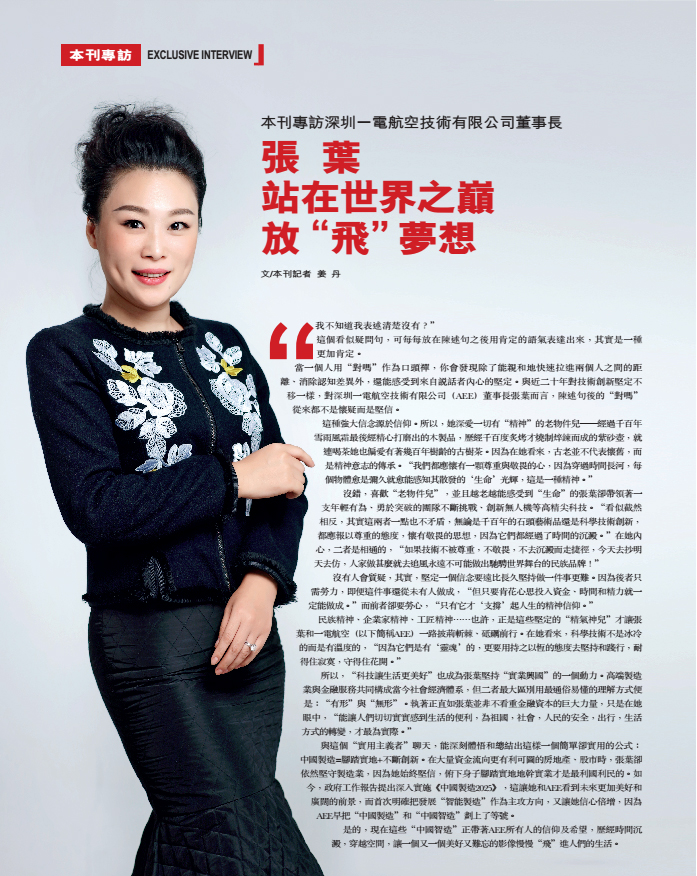 民族精神、企業家精神、工匠精神⋯⋯也許,正是這些堅定的“精氣神兒”才讓張葉和一電航空(以下簡稱AEE)一路披荊斬棘、砥礪前行。在她看來,科學技術不是冰冷的而是有溫度的,“因為它們是有‘靈魂’的,更要用持之以恆的態度去堅持和踐行,耐得住寂寞,守得住花開。”