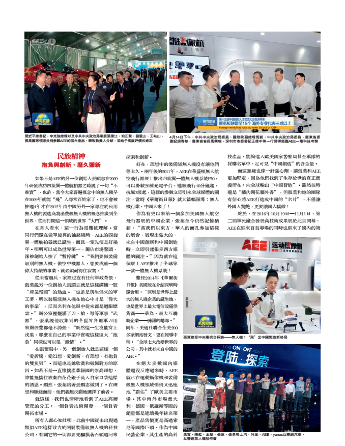作為此次成(chéng)果展AEE負責人,張葉說這次參展她永生難忘。不僅習近平總書記在參觀中饒有興趣地問到AEE載人旋翼機A—200的工作原理與直升機的區別和優勢,李克強總理還關切地詢問AEE在無人機行業中如何體現競爭力。張葉也由衷大膽道(dào)出心聲:“我們隻有持續不斷的創新,不斷做引領者。當所有人都(dōu)以為無人機是航拍器的時候,AEE做的是專業級一體無人機系統,做的是空中機器人,可以搭載幾十種光電平台。當大家都(dōu)準備做專業無人機時,AEE已經開始做相比無人機來說更加長航時、大載重的載人旋翼機了。”