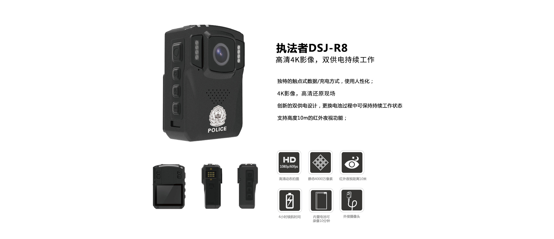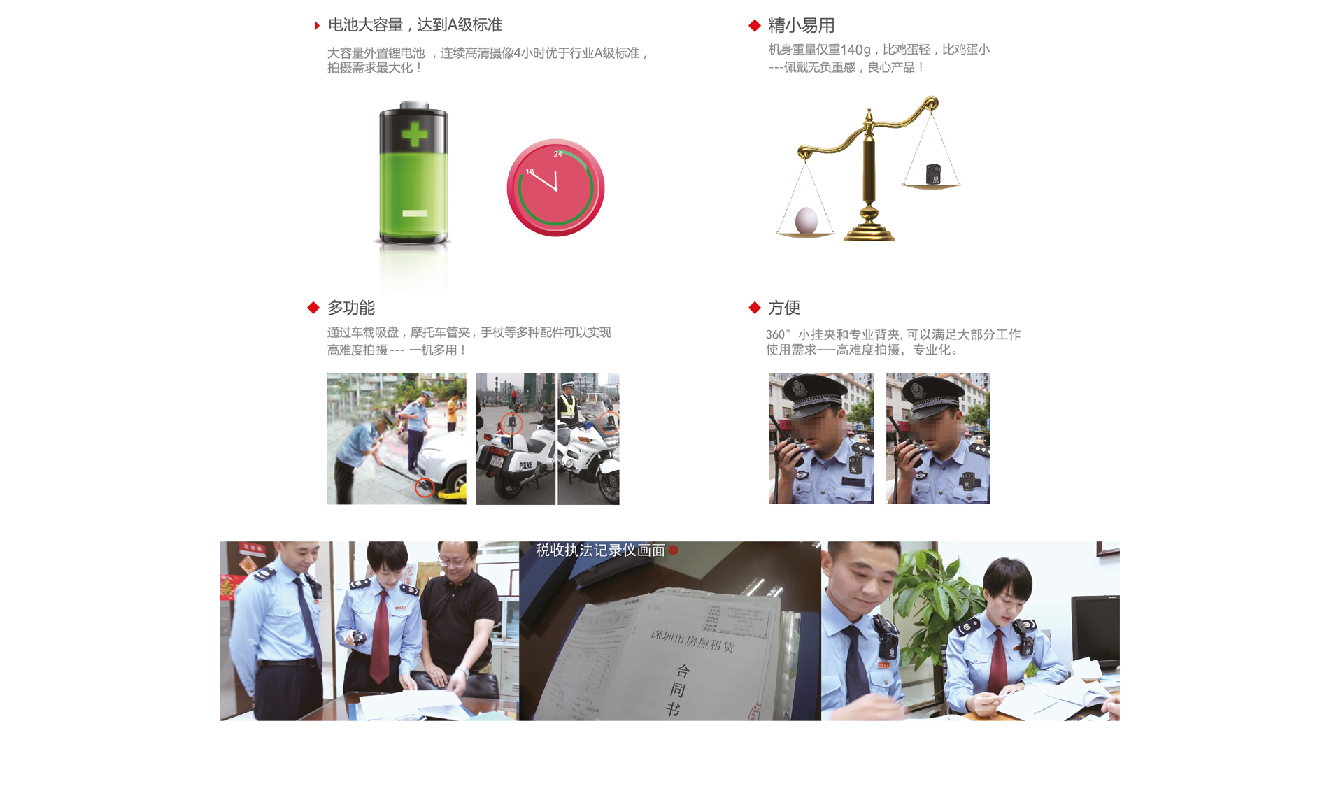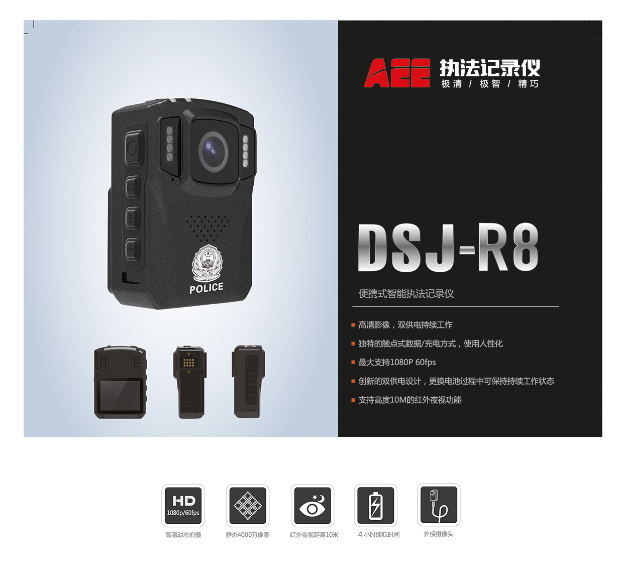 1、外形尺寸:78mm×57mm×36mm 2、顔色:黑色 3、質量:118g(不含配件) 4、外殼防護等級:IP68(水深1M,持續2h) 5、接口:具有标準的10pin USBMiniB物理接口,USB通訊協議爲USB2.0,USB接口傳輸速率爲480Mbps 6、攝錄功能(néng):開(kāi)機後(hòu)自動進(jìn)入取景預覽模式,按下相應鍵,自動開(kāi)始記錄音頻信息,按下停止鍵,停止記錄并保存記錄内容; 7、拍照功能(néng):具有定時拍照功能(néng),可設置間隔時間爲5s,10s,20s,30s,1min:可實現3張,5張,8張的連拍,連拍速度大于等于2張/s、具有延時拍照功能(néng),可設置間隔時間爲5s,10s。 8.語音播報功能(néng):且有語音播報功能(néng) 9、視音頻同步記錄功能(néng):回放時,數字音頻相對(duì)于視頻圖像不存在明顯的滞後(hòu)或超前,記錄/回放一段視頻畫面(miàn)時,其中人物說話的口型和聲音基本一緻,視音頻信号的失步時間小于等于1s; 10、浏覽、檢索和回放功能(néng):具有以時間等方式浏覽、檢索和回放本機存儲的視音頻、音頻、照片等信息的功能(néng);執法儀在待機狀态下,可一鍵回放最近一個視音頻文件,且有2X,4X,8X,16X,64X快進(jìn),快退模式。 11、字符疊加功能(néng):能(néng)在錄制視頻和所拍照片中自動疊加信息,信息包括:執法記錄儀編号,時間,日期和使用者信息等; 12、操作提示及狀态指示功能(néng):具有聲音和/或振動方式操作提示功能(néng),包括但不限于開(kāi)/關機提示,攝錄啓動/停止提示及錄音啓動/停止提示。能(néng)顯示電池電量、充電狀态、系統時間和存儲餘量等信息;開(kāi)機、錄音、攝錄狀态有明顯的光指示,開(kāi)機狀态指示爲綠色,錄音狀态指示爲黃色,攝錄狀态指示爲紅色。 13、時間校正功能(néng):能(néng)在連接上位機時通過(guò)管理軟件由管理員手動校正時間或設備自動與時間服務器同步時間,本機不能(néng)修改時間;可通過(guò)定位衛星同步時間。 14、異常報警功能(néng):具有電池欠壓、存儲溢出報警功能(néng),分體式執法記錄儀有視頻丢失報警功能(néng),電池欠壓報警後(hòu)電池剩餘量能(néng)保證執法記錄儀正常攝錄不小于5min但不超過(guò)30min; 15、數據完整功能(néng):對(duì)存儲數據加以保護,存儲的數據不被本機或未經(jīng)授權的上位機删除和覆蓋,編碼視頻流宜有防篡改、防非法複制等認證措施(如:水印疊加),以保證原始數據的完整性,在出現異常問題時能(néng)重啓,重啓後(hòu)已保存的數據不會丢失或損壞;執法儀在電量耗盡或關機前,可自動保存攝錄文件,在正常攝錄工作時更換電池,取下電池後(hòu)應能(néng)保持10min不斷電工作,攝錄視音頻文件不丢失或損壞。 16、日志記錄功能(néng):能(néng)對(duì)設備的運行狀态及操作進(jìn)行日志記錄,記錄開(kāi)/關時間、攝錄時間、錄音時間和照相等操作。日志記錄準确,日志的讀取和消除隻能(néng)通過(guò)上位機系統管理軟件操作完成(chéng); 17、上位機系統管理軟件功能(néng):執法記錄儀有對(duì)應的系統管理軟件,系統管理軟件具有以下主要功能(néng): a)分級管理及授權認證; b)對(duì)系統時間、密碼設置和分級管理等基本參數進(jìn)行設置; c)對(duì)執法記錄儀内記錄的文件進(jìn)行上傳、删除和查詢; d)能(néng)根據執法記錄儀編号、警員信息、時間進(jìn)行分類儲存和檢索; 系統管理軟件具有數據自動導入功能(néng),當執法記錄儀通過(guò)通訊接口與授權上位機連接時,能(néng)夠自動將(jiāng)執法記錄儀内部的視音頻信息、音頻信息、照片和日志數據上傳; 18、夜視功能(néng):具有夜視功能(néng),在開(kāi)啓夜視功能(néng)後(hòu),可看清距樣機8m處的人物面(miàn)部特征,距樣機15m處的人體輪廓;在3m距離處光線能(néng)覆蓋70%有效面(miàn)積。 19、色彩還(hái)原功能(néng):顯示及回放畫面(miàn)的顔色與被拍攝物顔色沒(méi)有明顯的偏色現象;且爲彩照 20、充電功能(néng):可通過(guò)連接專用适配器提供的電源對(duì)機器内置可充電電池進(jìn)行充電,也可支持USB接口充電和觸點式座充充電; 21、信息上傳功能(néng):執法記錄儀能(néng)上傳數據信息,上傳信息包含:所記錄的音視頻、音頻、照片、日志、執法記錄儀内部時間和存儲器容量信息; 22、信息下載/接收功能(néng):能(néng)下載/接收數據信息,下載/接收信息包含: a)用于校準執法記錄儀日曆鍾的信息,包括年月日時分秒; b)用于設定執法記錄儀工作方式的信息,如讀取記錄數據、删除記錄數據的控制指令等; 23、抓拍功能(néng):在攝錄過(guò)程中通過(guò)按下拍照鍵能(néng)抓拍與視頻分辨率相同的照片,而不影響正常的攝錄; 24、視音頻預錄、延錄功能(néng):能(néng)預錄、延錄觸發(fā)前後(hòu)大于等于3s的視音頻信息; 25、夾具調節功能(néng):标配兩(liǎng)個夾子,一個肩夾,一個背夾(背夾可360度旋轉) 26、可外接擴充功能(néng):可接收衛星數據并提供定位信息;可外接4G/GPS數據接口,觸點式外接攝像頭,同時能(néng)充電,傳數據,AV輸出。 28、省電模式功能(néng):具有省電模式,開(kāi)機後(hòu)可通過(guò)相應操作進(jìn)入省電狀态,按下恢複按鍵能(néng)推出省電模式; 29、快速攝錄功能(néng):在關機狀态下,長(cháng)按攝錄鍵可直接開(kāi)機進(jìn)入攝錄狀态; 30、數碼變焦功能(néng):在取景預覽模式下,可調節變焦功能(néng),支持4倍數字變焦功能(néng); 31,一鍵調節分辯率功能(néng):可一鍵調節分辯