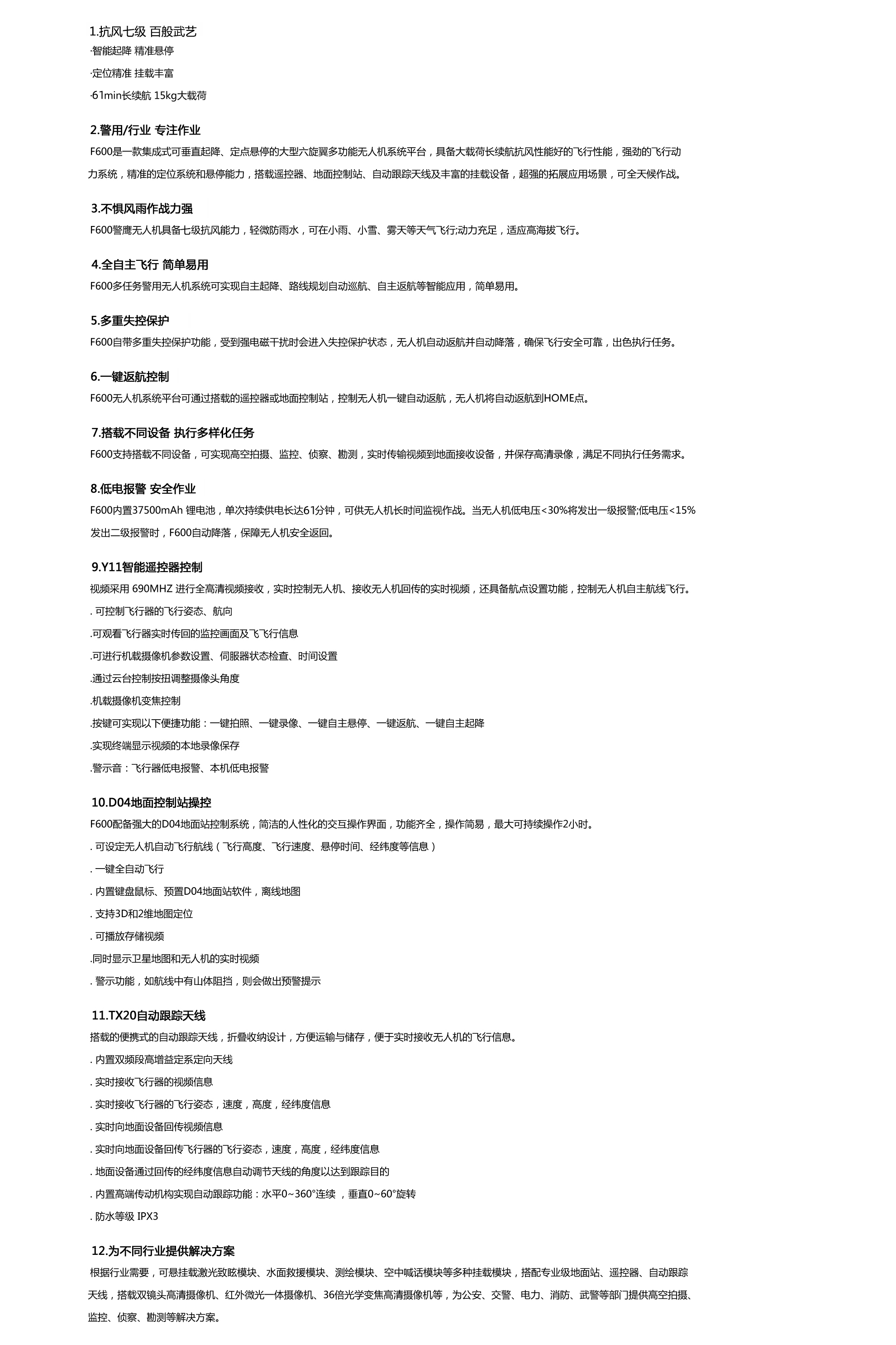 F600多任務型警用無人機産品參數規格: