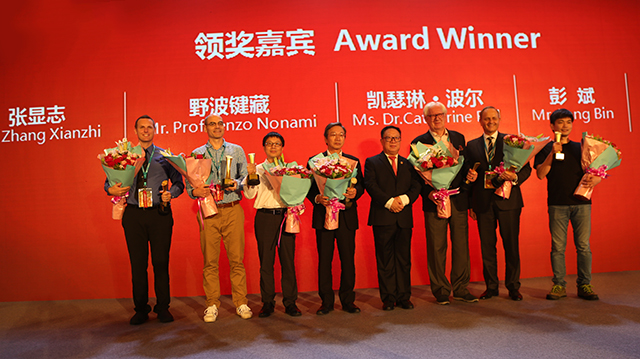 (AEE一電航空董事(shì)長(cháng)兼總裁張顯志先生榮獲第二屆全球無人機貢獻獎,AEE公司代表上台領獎)
