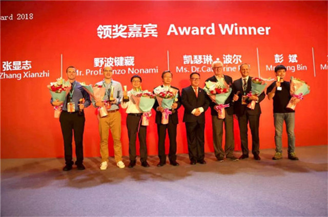 (AEE一電航空董事(shì)長(cháng)兼總裁張顯志先生榮獲第二屆全球無人機貢獻獎,AEE公司代表上台領獎)