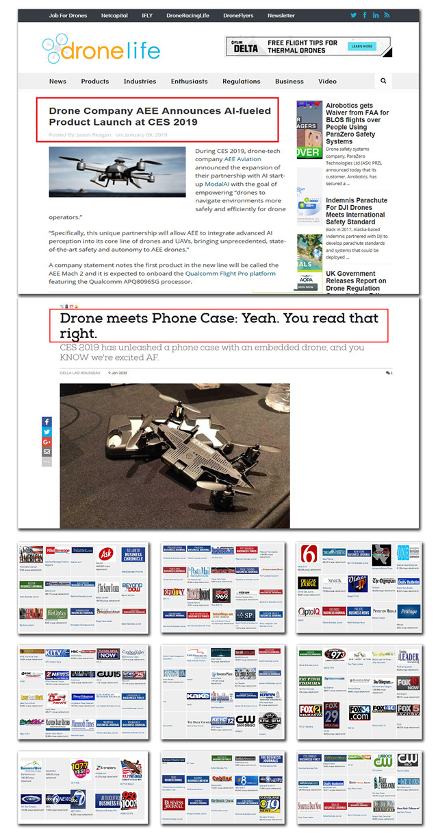 發(fā)布會現場,數百家全球國(guó)内外知名媒體齊齊聚焦AEE一電航空新品,其中包括《ABC News》、《NBC News》、《CBS News》、《美國(guó)商業期刊》、《新聞日報》、《Fox News》、《Telamundo》、《TMC.Net》、《Drone life》、《Into Tomorrow》、《深圳商報》、《寶安日報》、《科技36氪》、《無人機網》、騰訊、搜狐等,這(zhè)些媒體所報道(dào)的新聞資訊迅速在網上獲得無數稱贊。