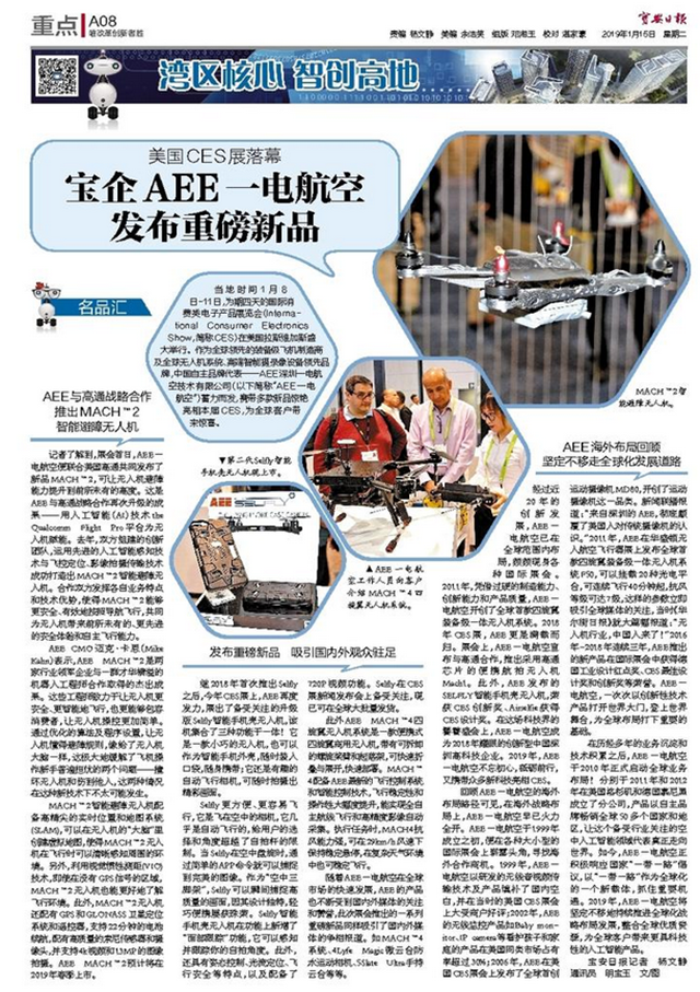 經(jīng)過(guò)近20年的創新發(fā)展,AEE一電航空已在全球範圍内布局,頻頻現身各種(zhǒng)國(guó)際展會。2011年,憑借過(guò)硬的制造能(néng)力、創新能(néng)力和産品質量,AEE一電航空開(kāi)創了全球首款四旋翼裝備級一體無人機系統。2018年CES展,AEE更是滿載而歸。展會上,AEE一電航空宣布與高通合作,推出采用高通芯片的便攜航拍無人機Mach1。此外,AEE發(fā)布的SELFLY智能(néng)手機殼無人機,榮獲CES創新獎、Airselfie獲得CES設計獎。在這(zhè)場科技界的饕餮盛會上,AEE一電航空成(chéng)爲2018年耀眼的創新型中國(guó)深圳高科技企業。2019年,AEE一電航空不忘初心,砥砺前行,又攜帶衆多新科技亮相CES。