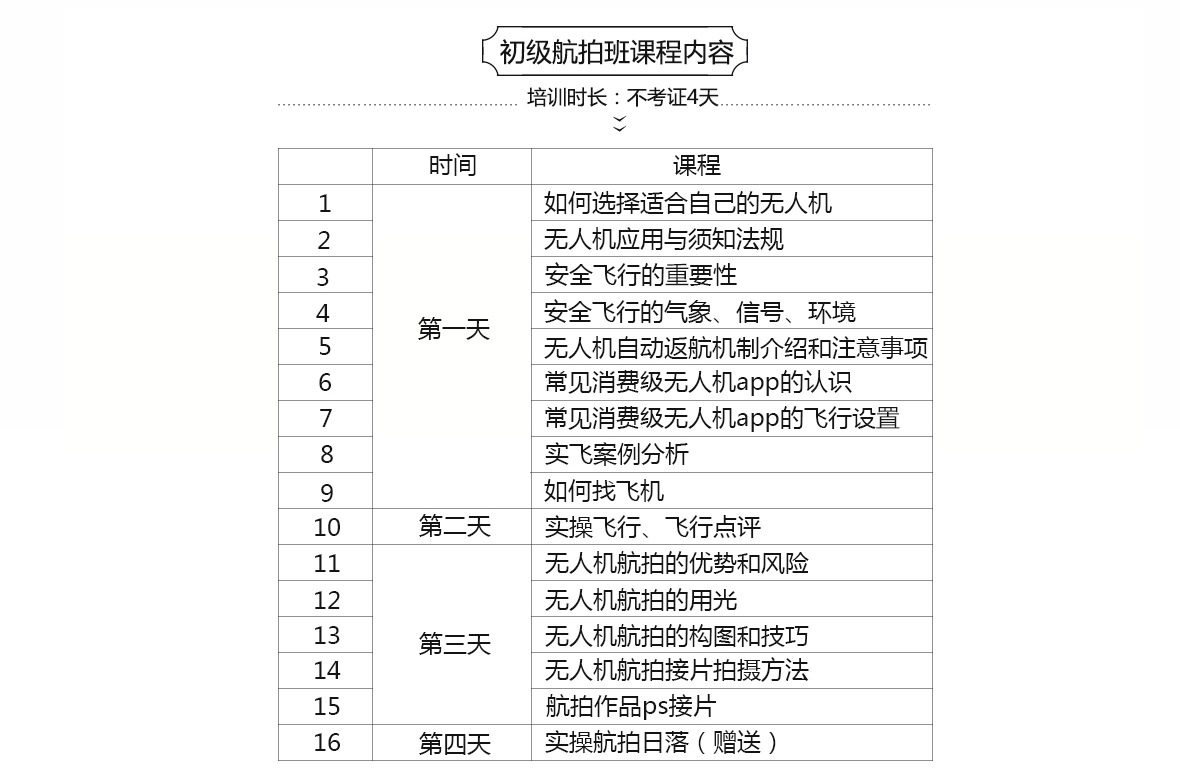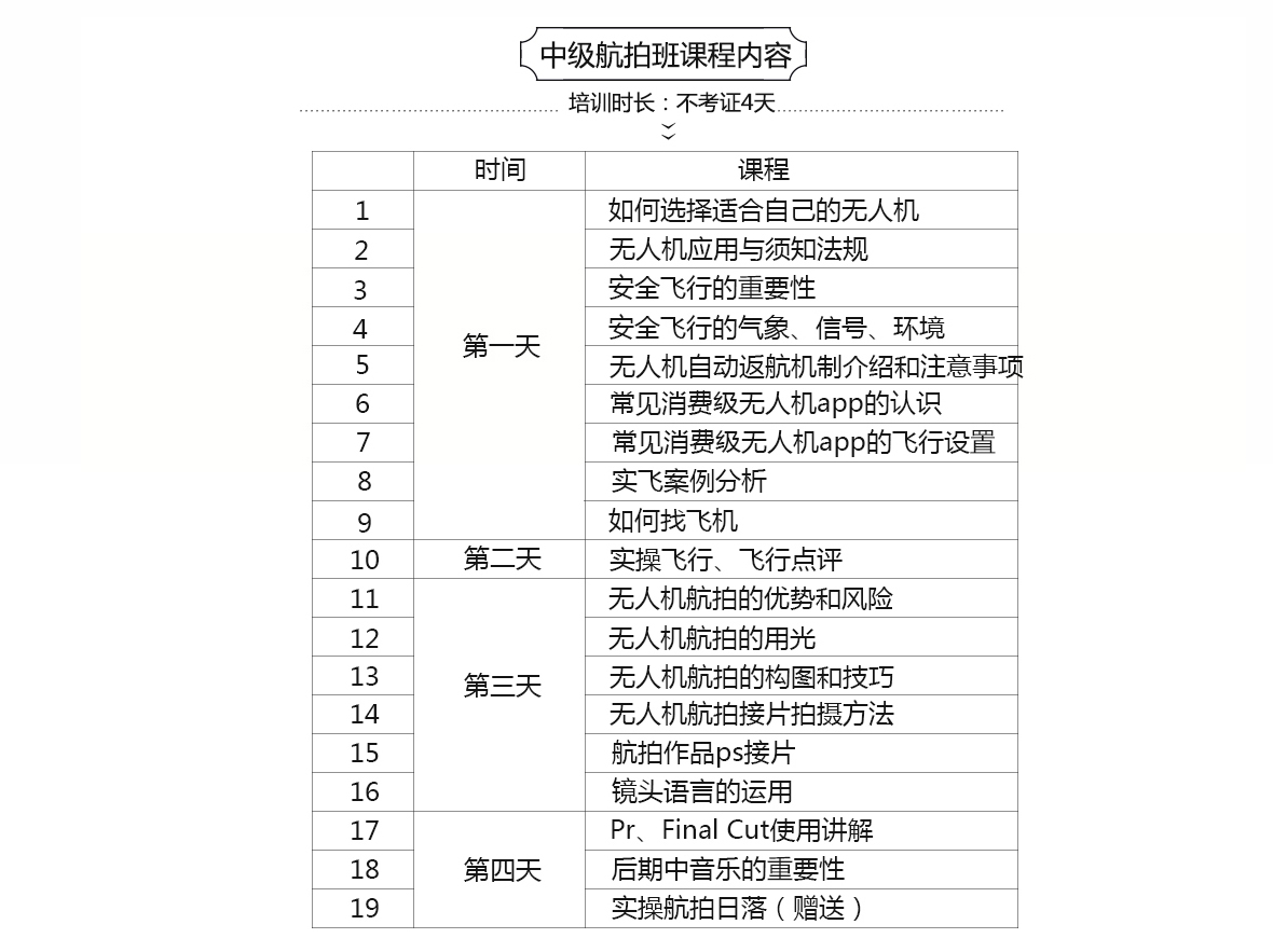 航拍課程分爲初級航拍班、中級航拍班、高級航拍班三個等級。