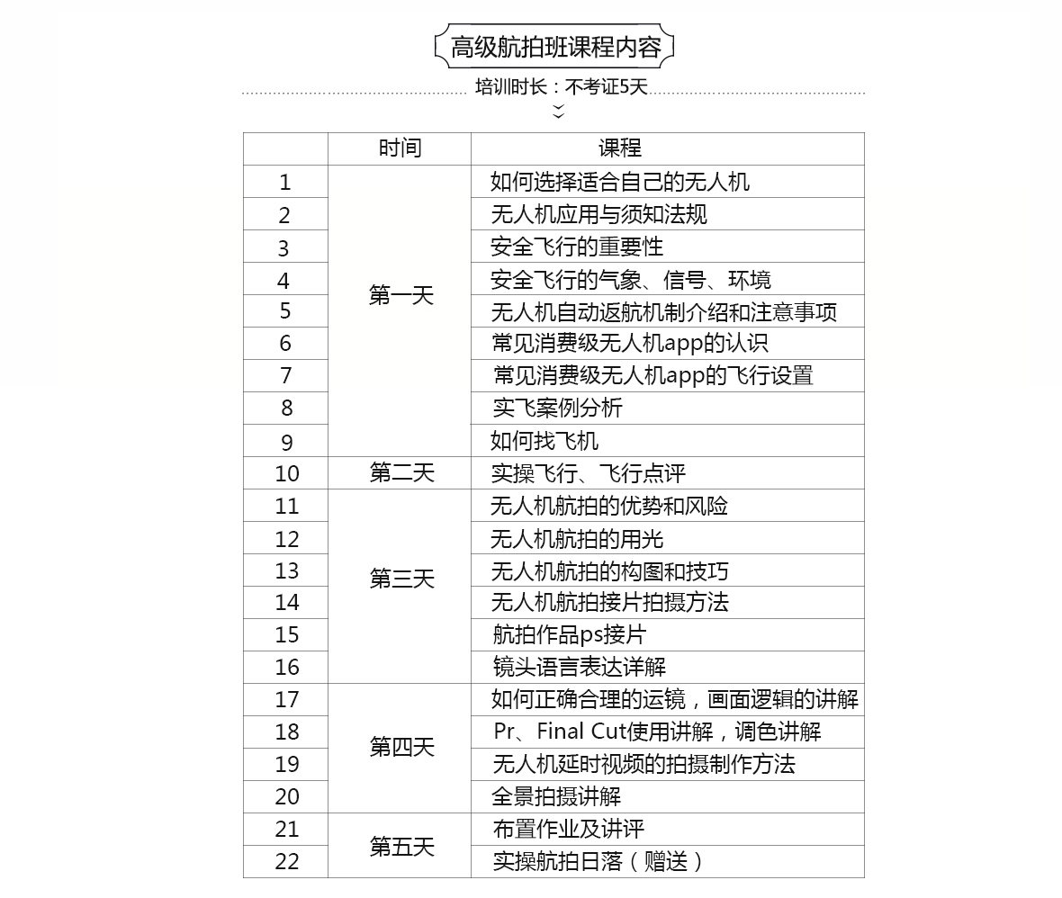航拍培訓時間靈活,初中高級航拍培訓時間依次增長(cháng),最長(cháng)5天。
