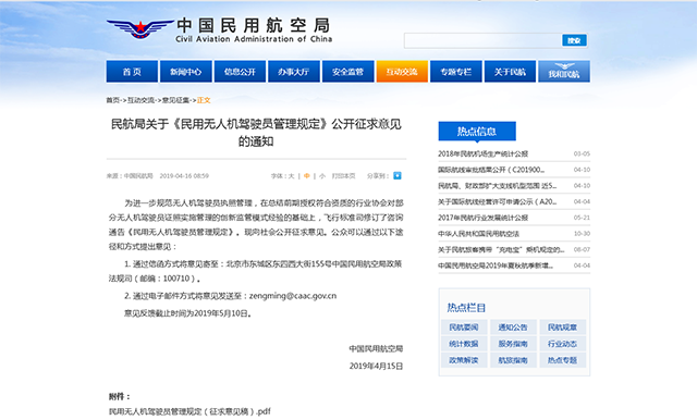 爲進(jìn)一步規範無人機駕駛員執照管理,在總結前期授權符合資質的行業協會對(duì)部分無人機駕駛員證照實施管理的創新監管模式經(jīng)驗的基礎上,飛行标準司修訂了咨詢通告《民用無人機駕駛員管理規定》。現向(xiàng)社會公開(kāi)征求意見。公衆可以通過(guò)以下途徑和方式提出意見:
