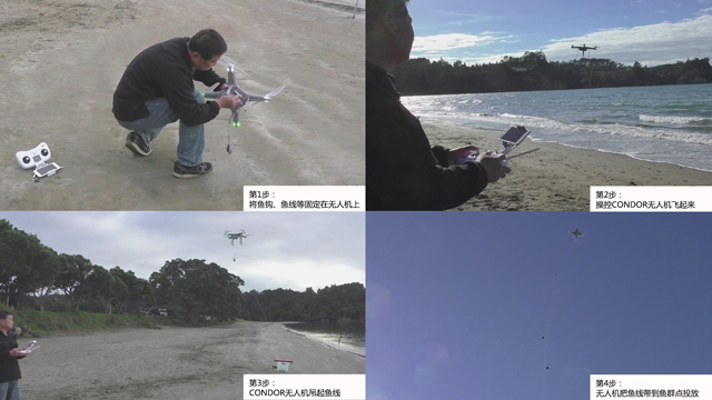 原來隻需將(jiāng)魚鈎、魚餌和魚線固定在無人機上,然後(hòu)操控無人機盤旋飛至海面(miàn)上方,通過(guò)無人機吊起(qǐ)魚線,把魚餌帶到魚群經(jīng)常出沒(méi)的地點,随後(hòu)就是耐心地等待好(hǎo)魚上鈎,最後(hòu),將(jiāng)魚兒緩慢地拖上岸就大功告成(chéng)了。